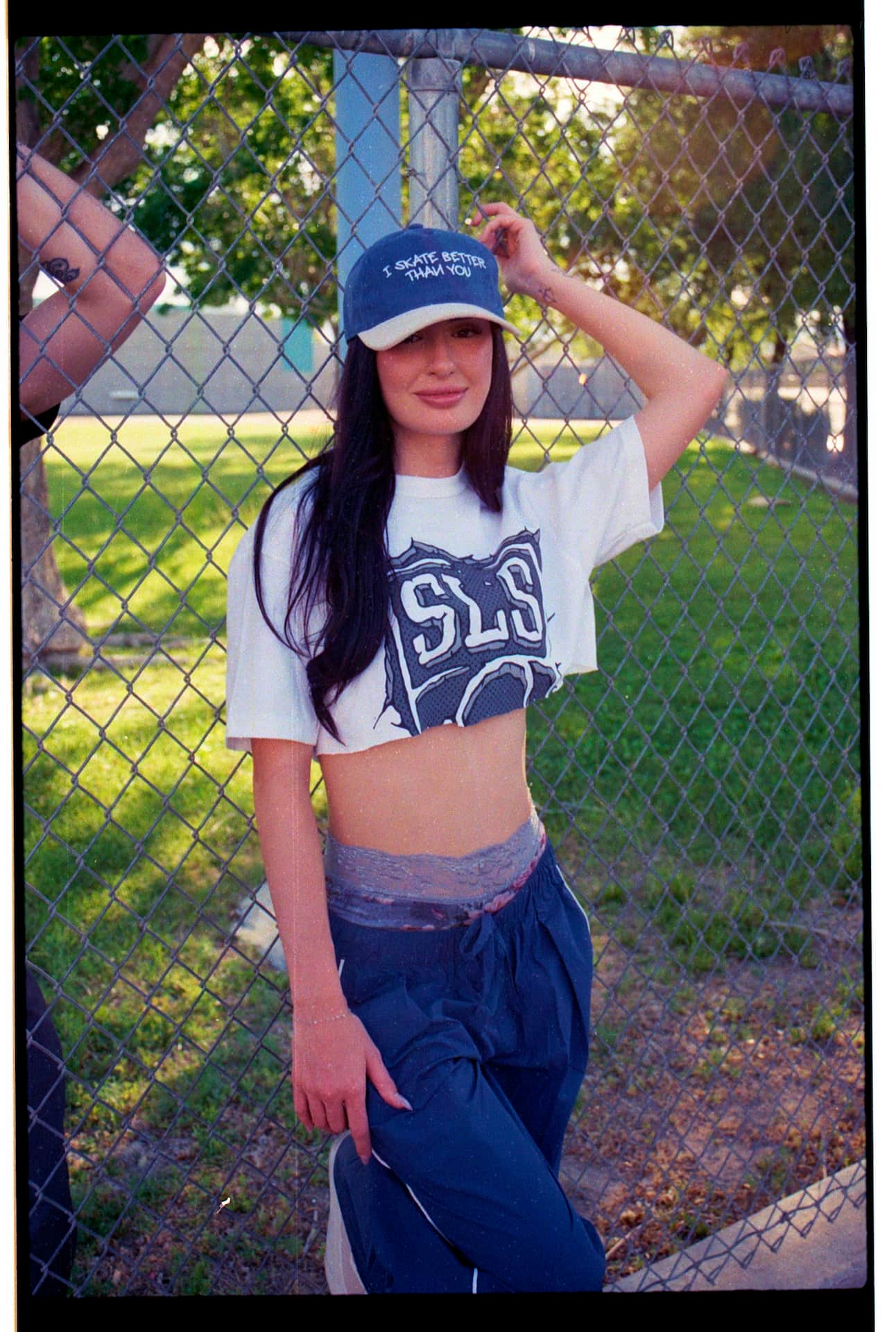 Navy snapback with contrast brim. Front hit reads ‘I SKATE BETTER THAN YOU’ in white. Straight talk, no filter.