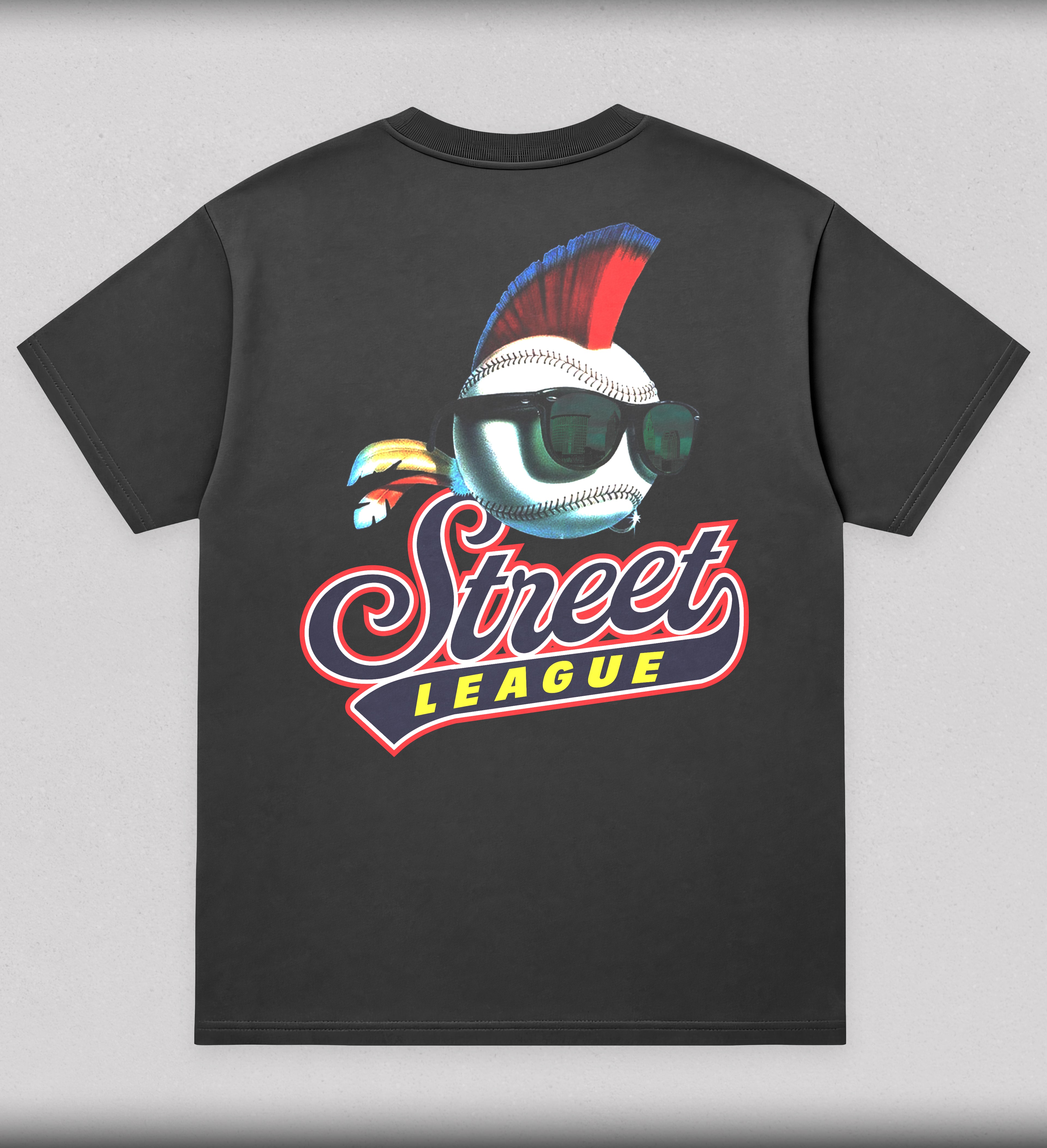 Black tee with a baseball-punk graphic hit. Street League across the back in bold retro script. Sport energy, skate a...