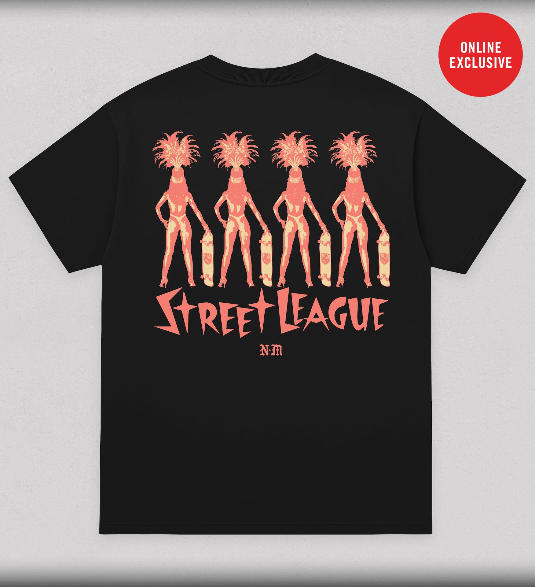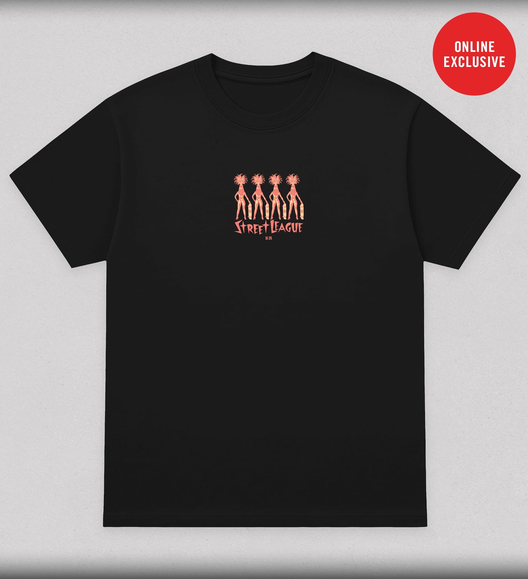 Black heavyweight cotton tee with a bold four-showgirl graphic and retro Street League lettering across the back. Des...