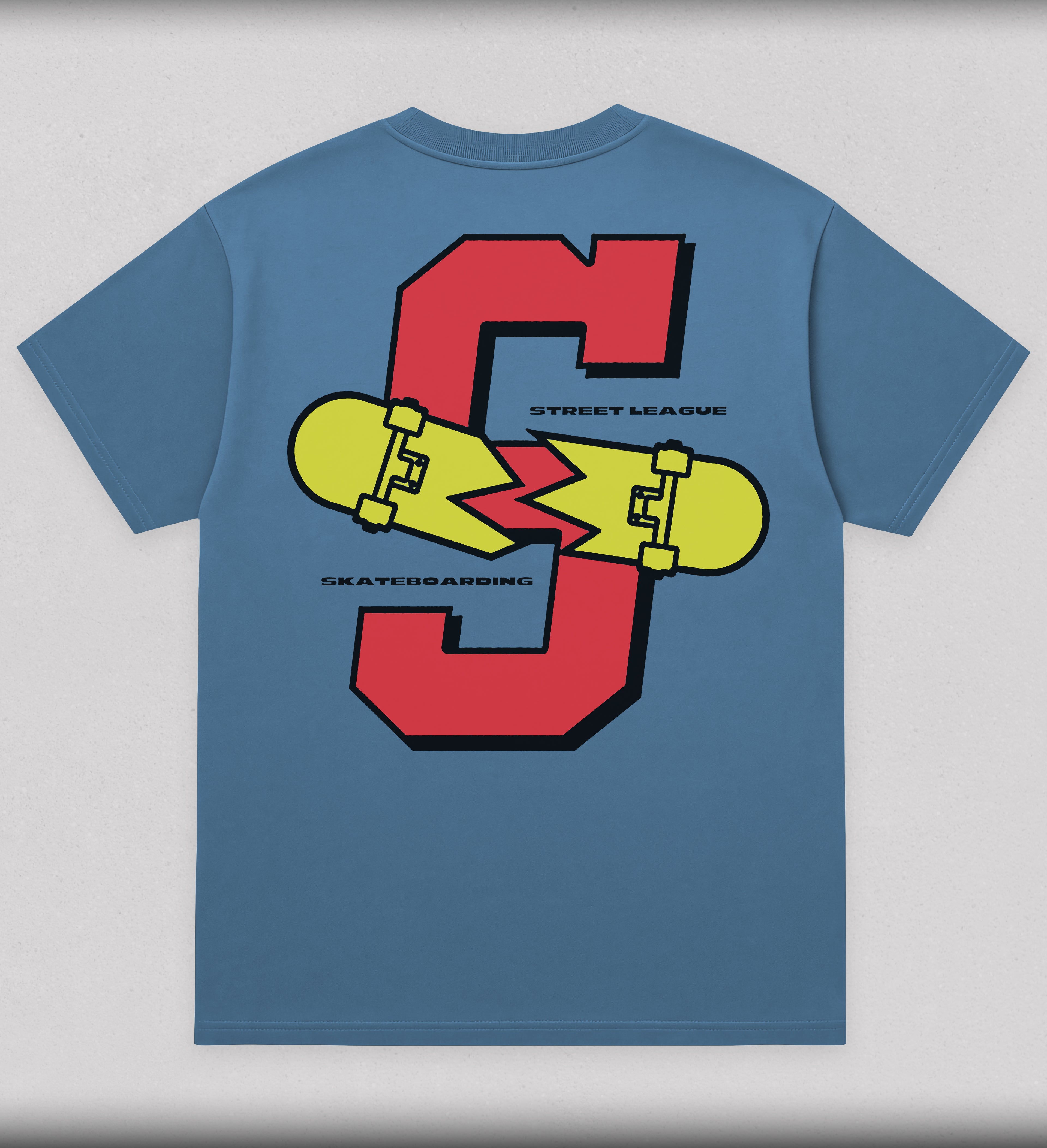 Blue tee with front S logo hit. Back print shows bold red S with a snapped yellow skateboard through the center. Stre...