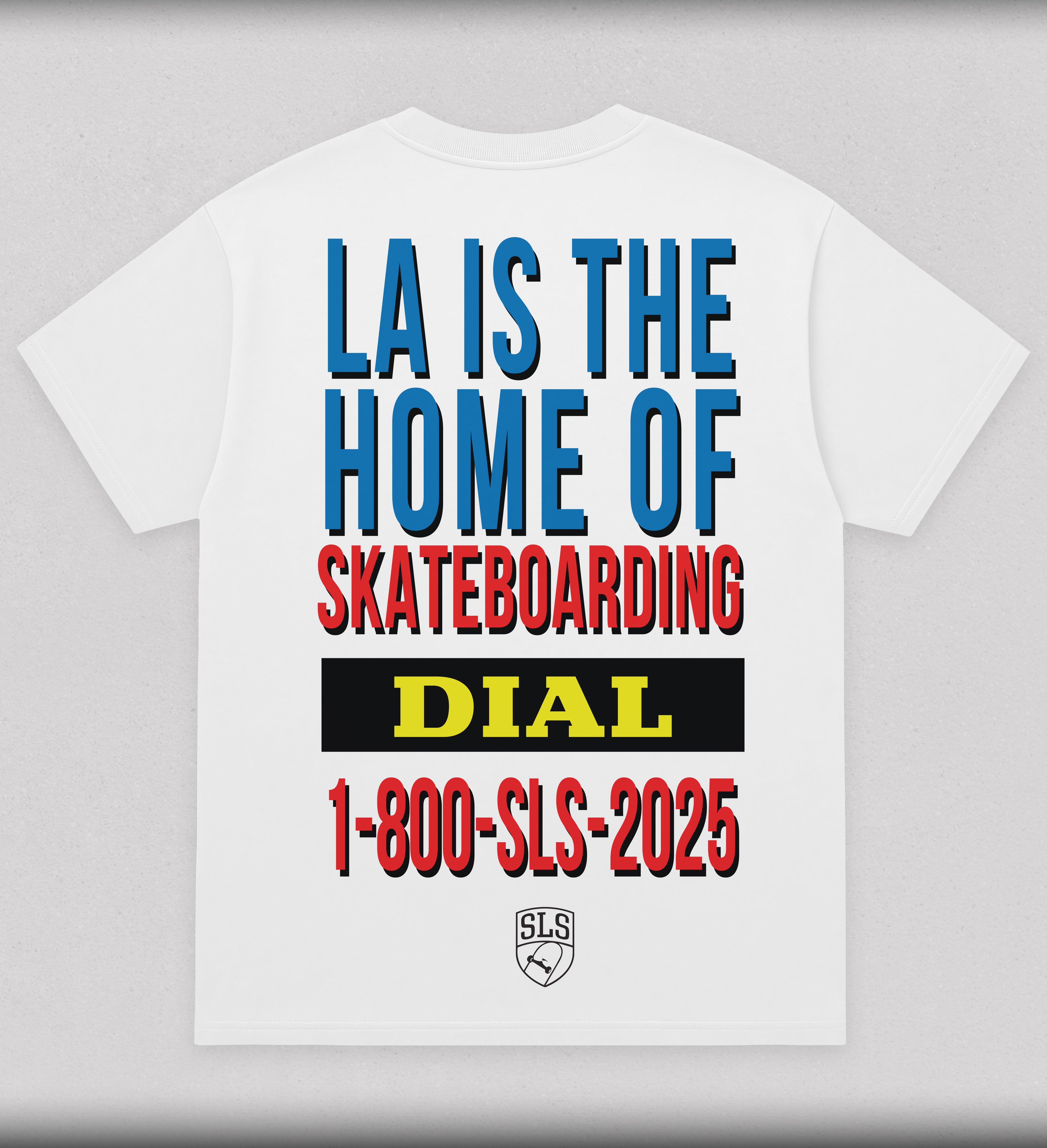 White tee with small SLS shield on the front. Back print declares ‘LA IS THE HOME OF SKATEBOARDING’ with hotline-styl...